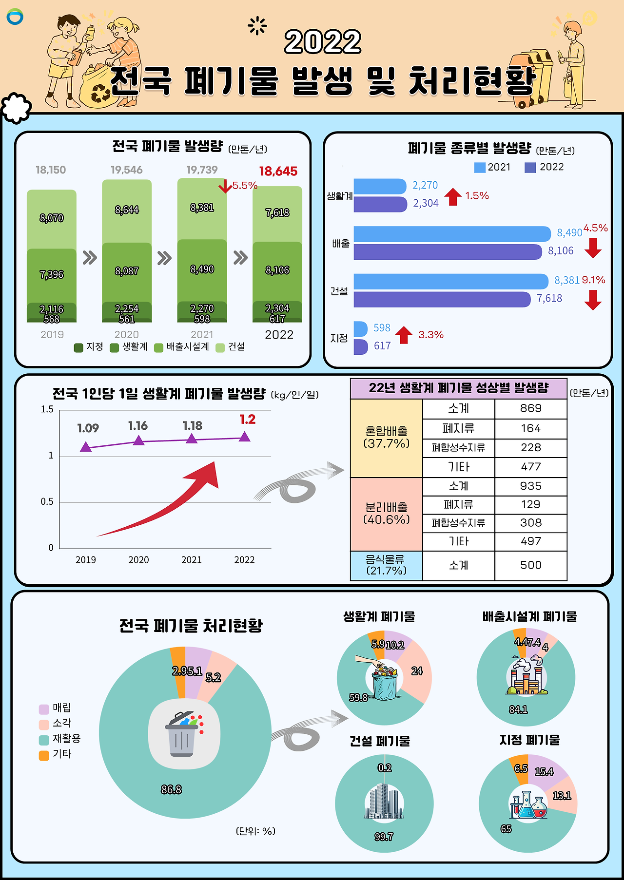 2022년의 경우, 건설 폐기물의 발생량은 약 5,000만 톤에 달합니다. 이는 전체 폐기물 중 상당한 비율을 차지하고 있으며, 매년 증가하는 추세입니다.