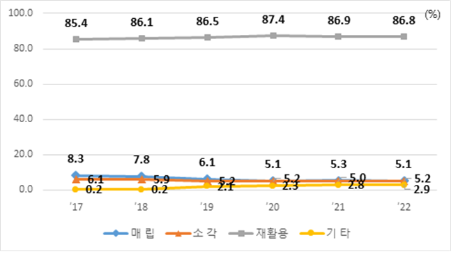 통계에 따르면, 건설 폐기물의 재활용률은 최근 몇 년간 꾸준히 상승하고 있으며, 2022년에는 약 87.6%에 달했습니다.